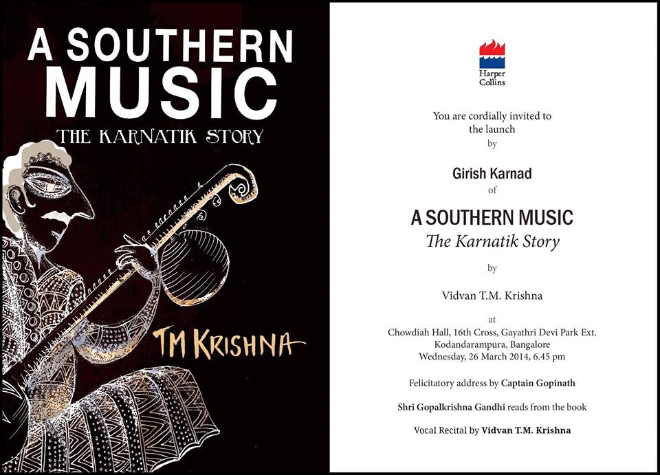 The second edition of T.M. Krishna's 'A Southern Music: The Karnatik Story' will by unveiled by Shri Girish Karnad on March 26th, at Chowdiah Hall, Bengaluru, 6:45pm. Everyone is welcome.